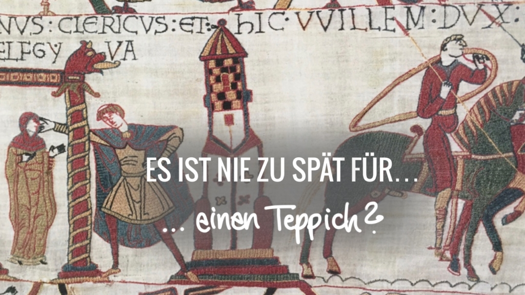 Dieser Teppich ist rund einen halben Meter hoch und 68 Meter lang, und er zeigt 58 einzelne Szenen. Welche Szenen sollten gezeigt werden? Auf welche Details legte man besonderen Wert? Die Schlacht von Hastings – Geschichtswissen hervorgekramt – war 1066. Der Teppich entstand bereits um 1070, so dass die Wahl der Szenen einen guten Eindruck vermitteln, was dem Auftraggeber wichtig war. Wahrscheinlich war das Bischof Ode, der Bruder von Wilhelm dem Eroberer. Er selbst wird auch mehrmals dargestellt, und mit einer bedeutenderen Rolle gezeigt, als es andere zeitgenössische Quellen berichten.