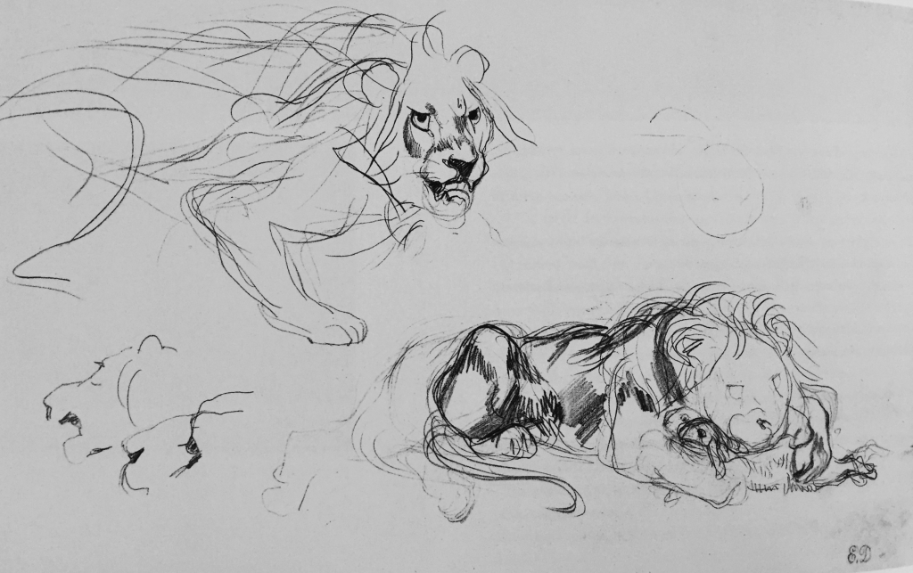 Der Maler Eugène Delacroix bannte nicht nur zahlreiche Löwen auf Leinwände und Skizzenblöcke, er wurde sogar mit den Löwen verglichen, die er malte: Théophile Gautier beschrieb ihn als „sanft, samtweich und schmiegsam wie eine jener Wildkatzen, die er noch in der Fähigkeit übertraf, sich abwechselnd fügsam und furchterregend zu erweisen.“
