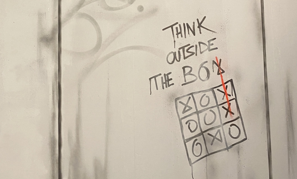 Das Bild von Banksy zeigt die enorme Faszination kreativer Lösungen sehr deutlich: Eigentlich ist das Spiel 3 gewinnt bereits verloren. Alle neun Felder des Spielquadrats sind ausgefüllt und weder X noch O konnte 3 Kreuze oder drei Kreise waagrecht, senkrecht oder diagonal verbinden. Aber X verbindet das X des Wortes BOX mit seinen beiden Kreuzen und vervollständigt seine 3-er-Reihe. Wie genial, doch noch gewonnen!